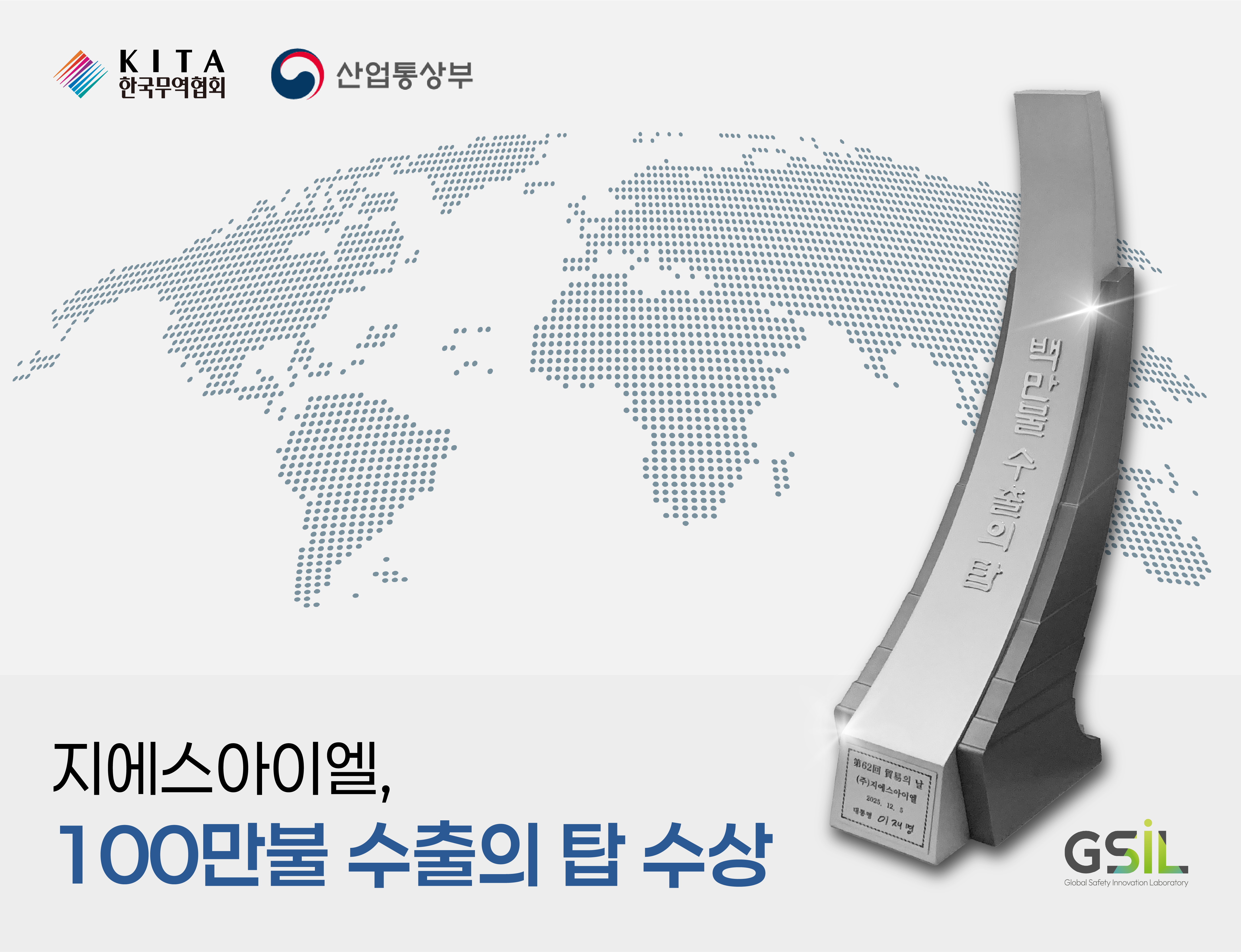 GSIL, '제62회 무역의 날' 100만불 수출의 탑 수상지에스아이엘이 제62회 무역의 날을 맞아 해외 시장 개척 성과를 인정받아 ‘100만불 수출의 탑’을 수상했습니다. 진입 장벽이 높은 글로벌 산업안전 시장에서 사우디 아람코의 주요 가스전 프로젝트에 솔루션을 공급하며 독보적인 기술 신뢰도를 입증했습니다. 이번 수상은 중동을 비롯한 세계 에너지·플랜트 시장에서 한국 스마트 안전 기술의 경쟁력을 확인한 중요한 이정표가 되었습니다. 앞으로도 글로벌 파트너십을 더욱 강화하여 전 세계 산업 현장의 안전 표준을 선도하는 글로벌 기업으로 성장해 나가겠습니다.